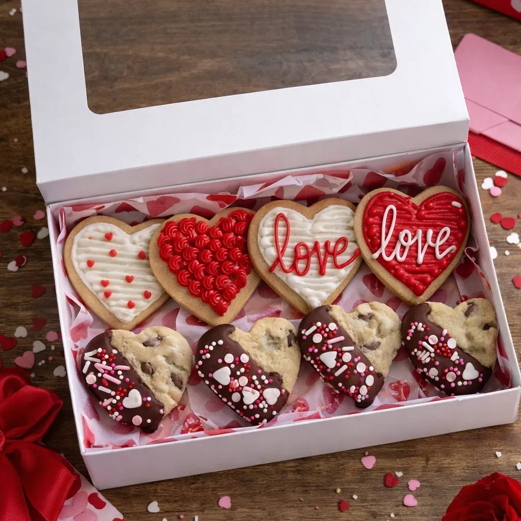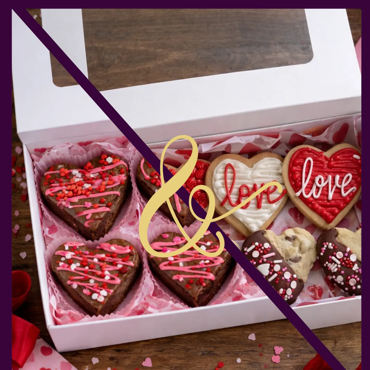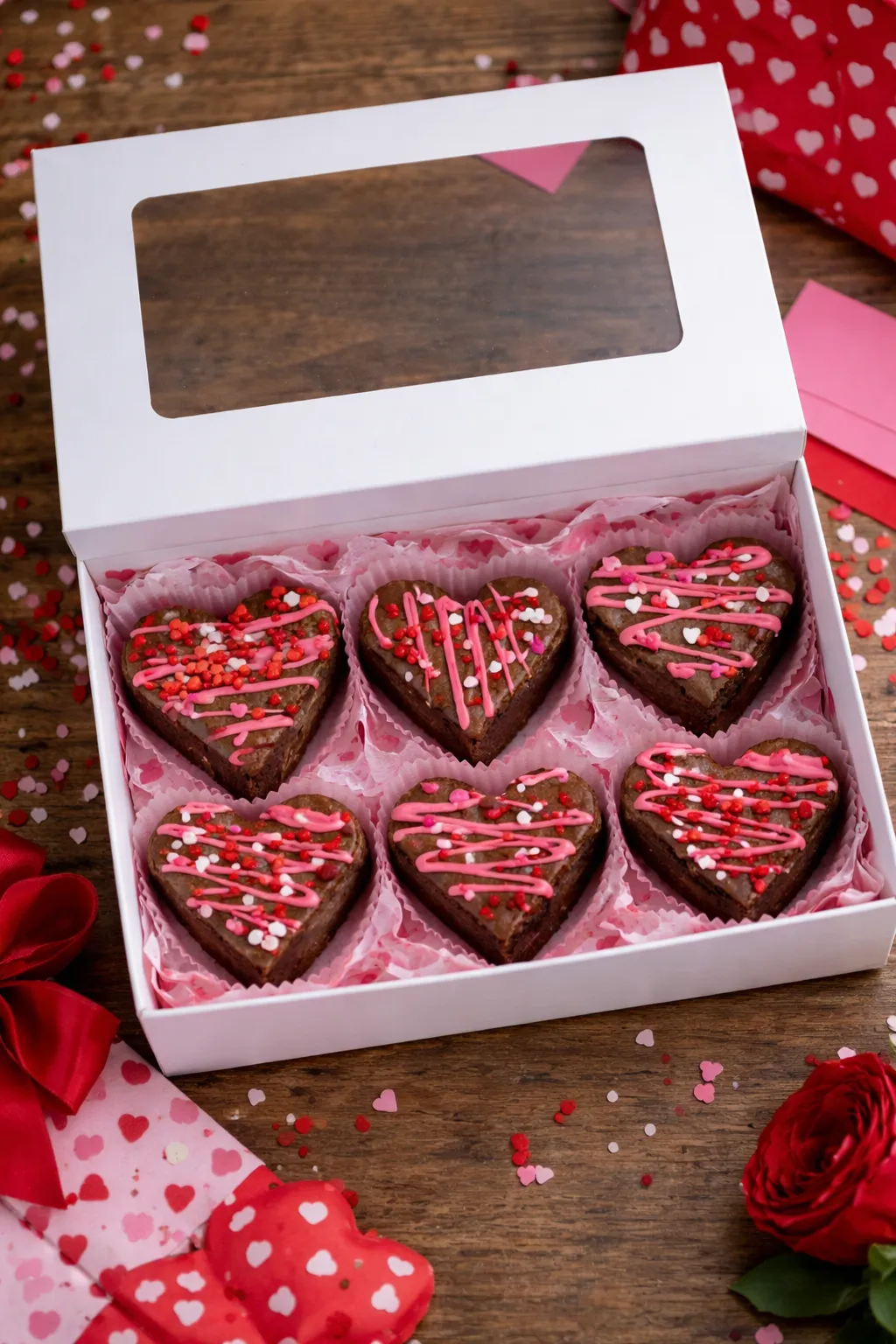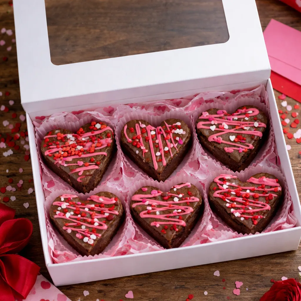 Six large, rich, fudgy brownies baked in heart shapes and decorated for Valentine’s Day.